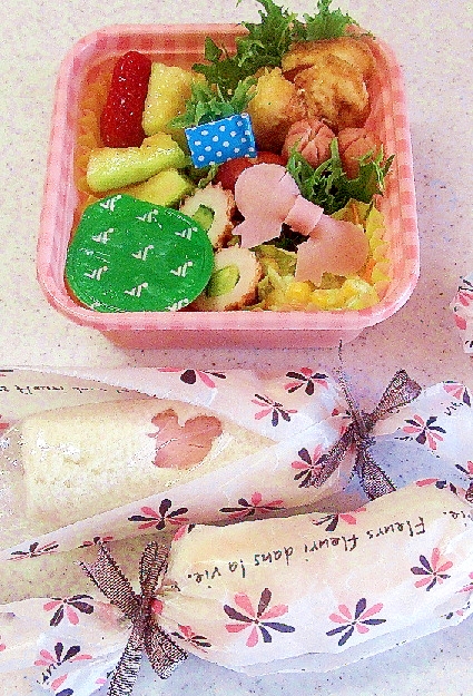 リボン付けるとかわいい ロールサンドのラッピング かわいいおべんとう